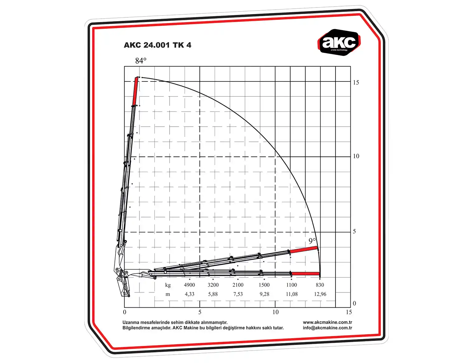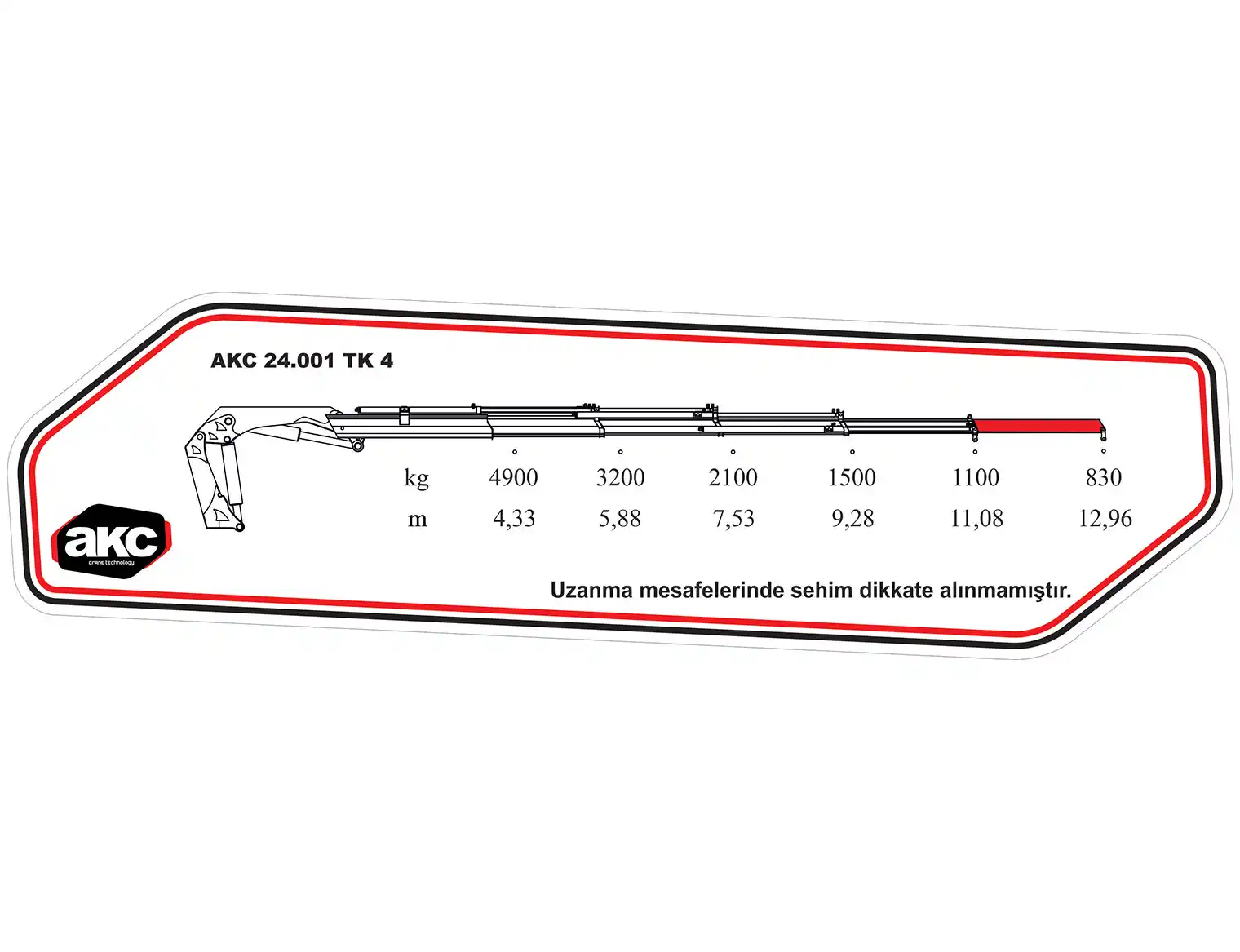 Преклопниот кран AKC 24.001 TK4 нуди висока маневрираност во тесни простори со својата четиристепена хидраулична стрела и дополнителна механичка структура на стрелата. Овој модел обезбедува сигурни перформанси при лесни потреби за кревање, а неговиот компактен дизајн на каросеријата го олеснува користењето во градежништвото, логистиката и индустриските проекти.