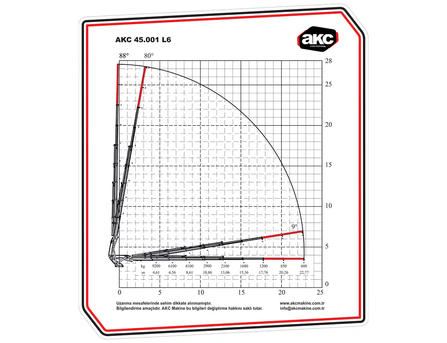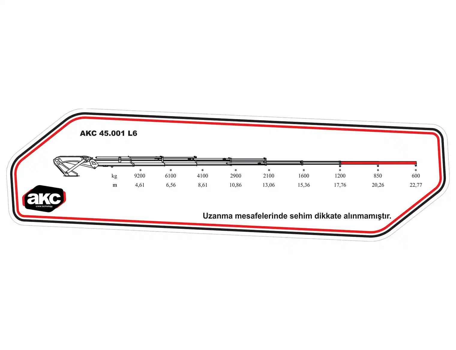 Преклопниот кран AKC 45.001 L6 нуди широк дофат благодарение на неговата 6-степена хидраулична структура на стрелата, обезбедувајќи супериорна маневрирање во тесни простори. Неговото издржливо тело и сигурните перформанси на кревање ја зголемуваат ефикасноста во градежништвото, логистиката и индустриските проекти.