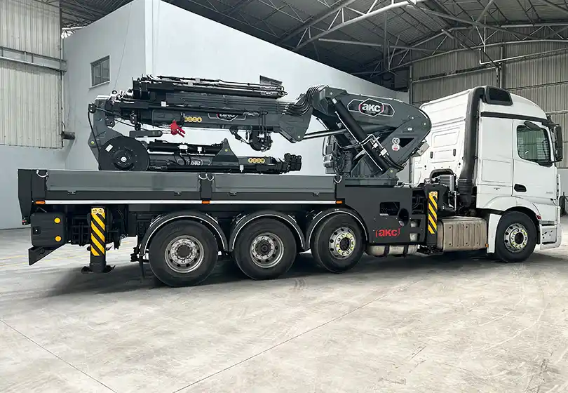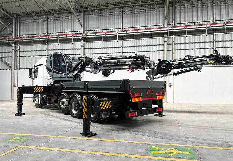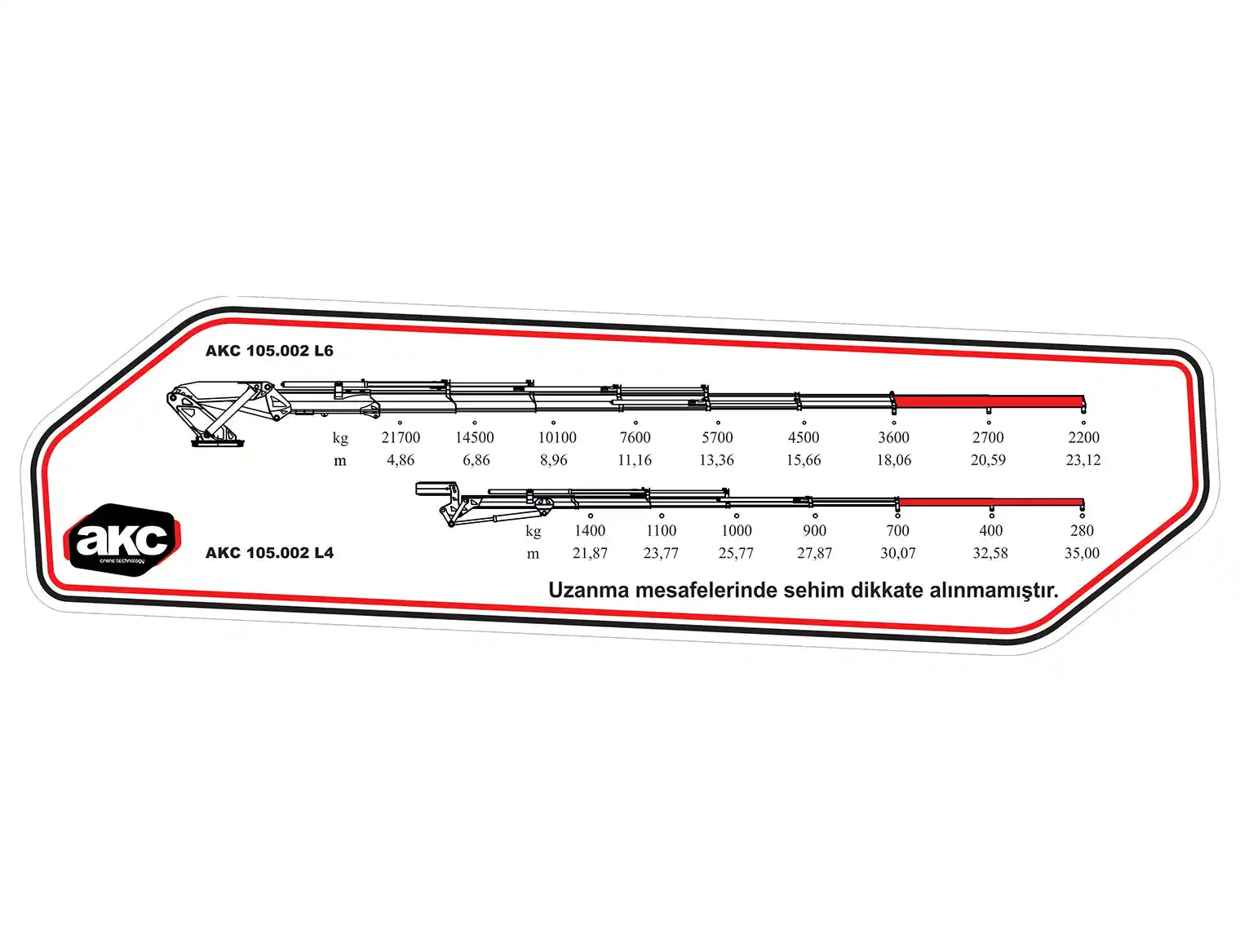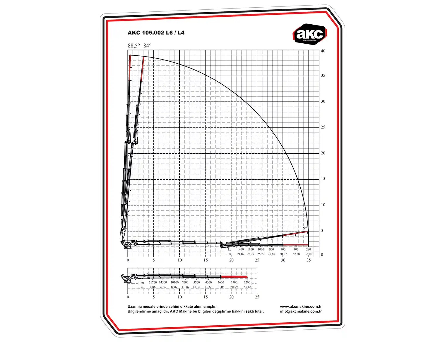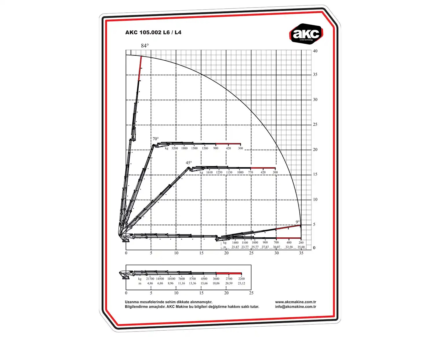 AKC 105.002 L6 / L4 Katlanır Bomlu Vinç, kompakt gövdesi, yüksek manevra kabiliyeti ve esnek erişim imkânı ile hem dar alanlarda hem de geniş sahalarda üstün performans sağlar. Çift kırma bom sistemi, yüklerin farklı mesafelerde ve açılarda güvenle kaldırılmasına imkân tanırken, dayanıklı gövde yapısı uzun süreli kullanımlarda dahi istikrarlı sonuç verir.