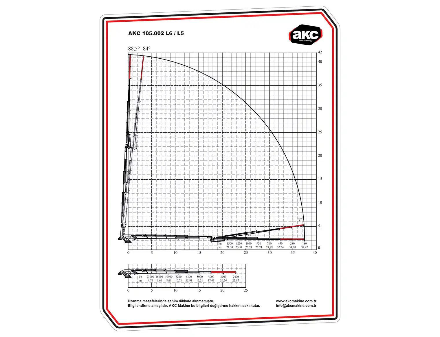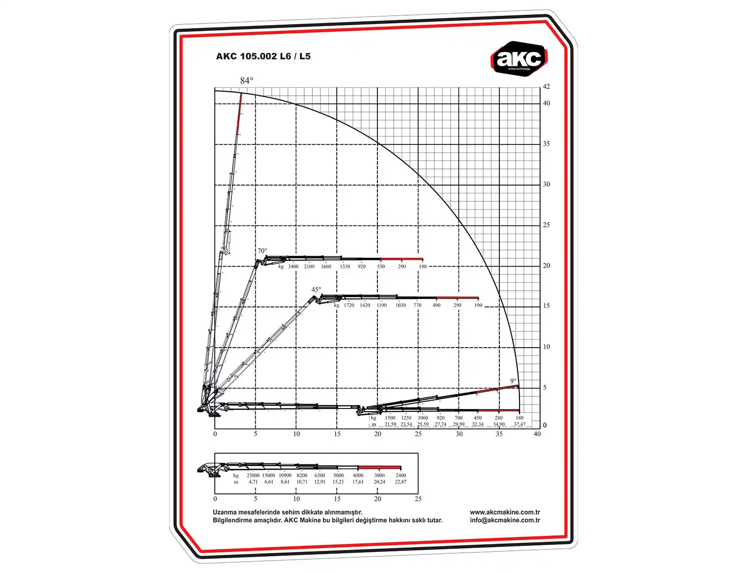 AKC 105.002 L6 / L5 A.D Katlanır Bomlu Vinç, kompakt tasarımı ve esnek bom kombinasyonu sayesinde hem dar alanlarda hem de geniş sahalarda yüksek verimlilik sağlar. Yüksek manevra kabiliyeti ve güvenli kaldırma kapasitesi, onu inşaat, lojistik ve endüstriyel projelerde tercih edilen bir çözüm haline getirir.
