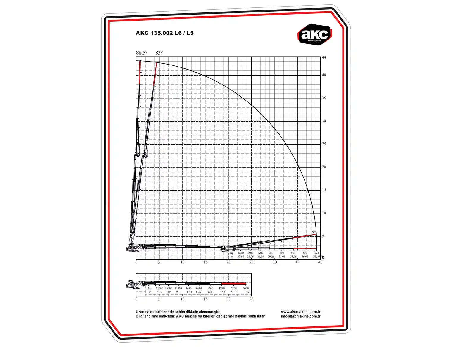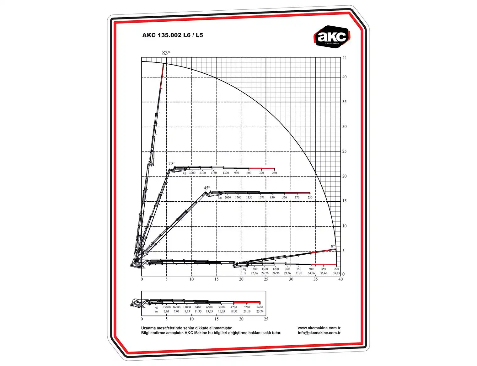 AKC 135.002 L6 / L5 Katlanır Bomlu Vinç, kompakt tasarımı ve esnek bom yapısıyla hem dar alanlarda hem de geniş sahalarda yüksek verimlilik sağlar. Geniş erişim kapasitesi, güvenilir kaldırma performansı ve üstün manevra kabiliyeti sayesinde inşaat, lojistik ve endüstriyel projelerde etkin çözümler sunar.