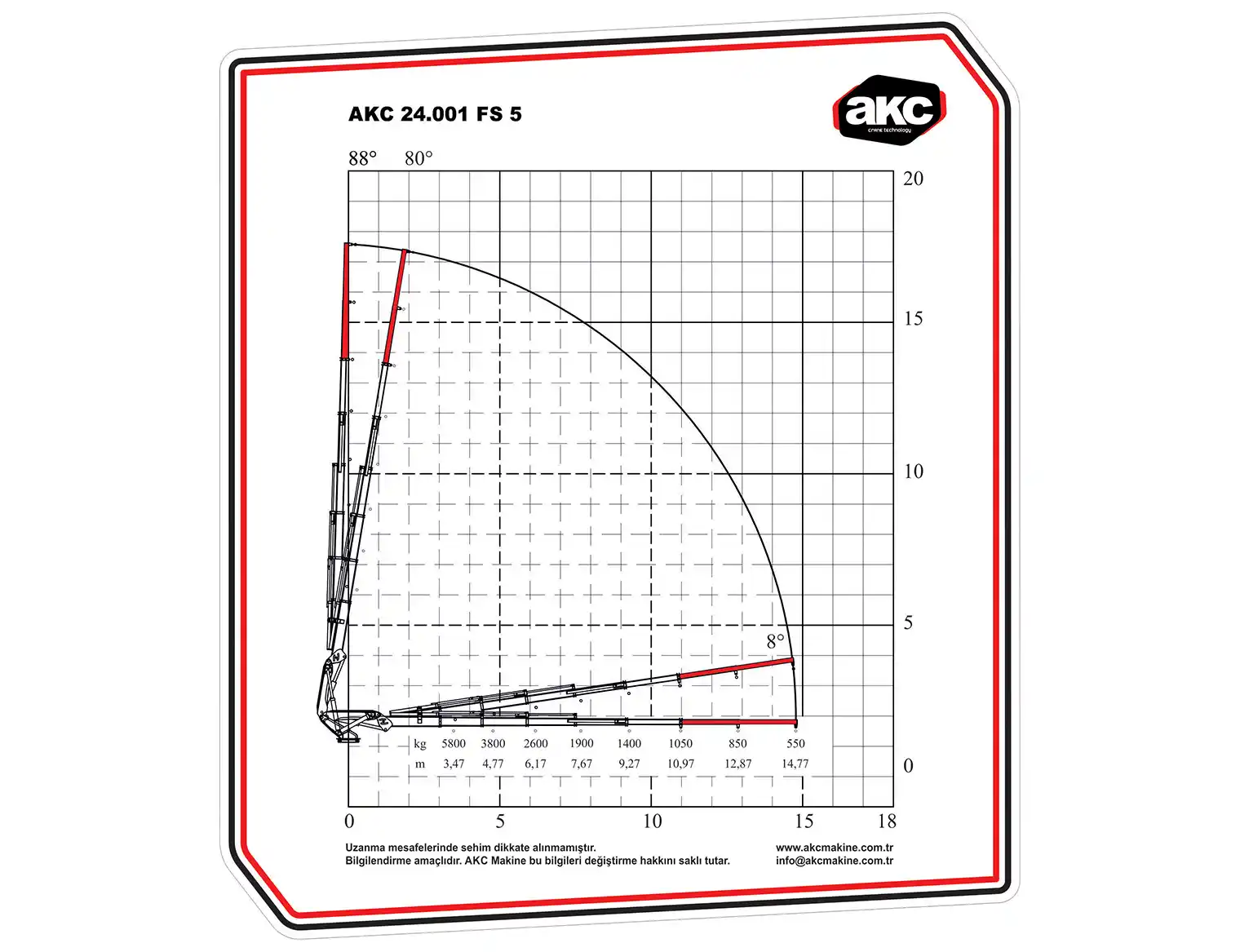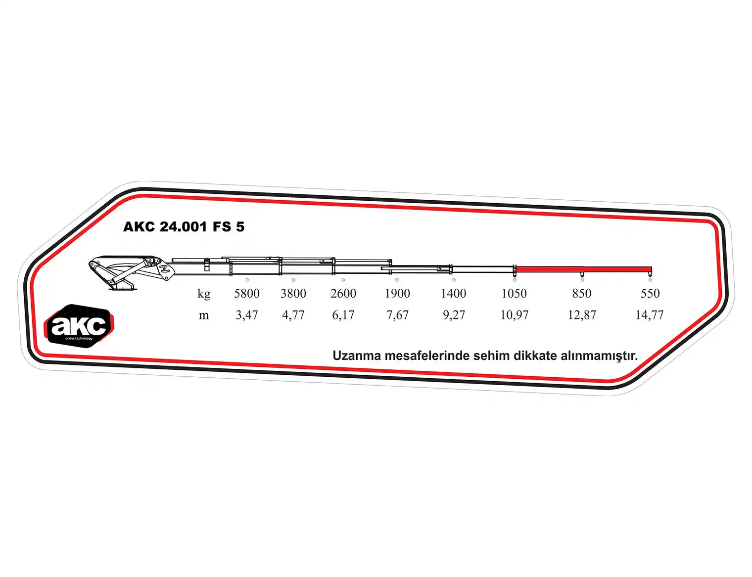KC 24.001 FS 5 Katlanır Bomlu Vinç, 5 kademeli hidrolik bom yapısı sayesinde dar alanlarda yüksek manevra kabiliyeti sunar. Kompakt tasarımı ve güvenilir kaldırma kapasitesiyle inşaat, lojistik ve endüstriyel projelerde hafif yük operasyonlarında verimliliği artırır.