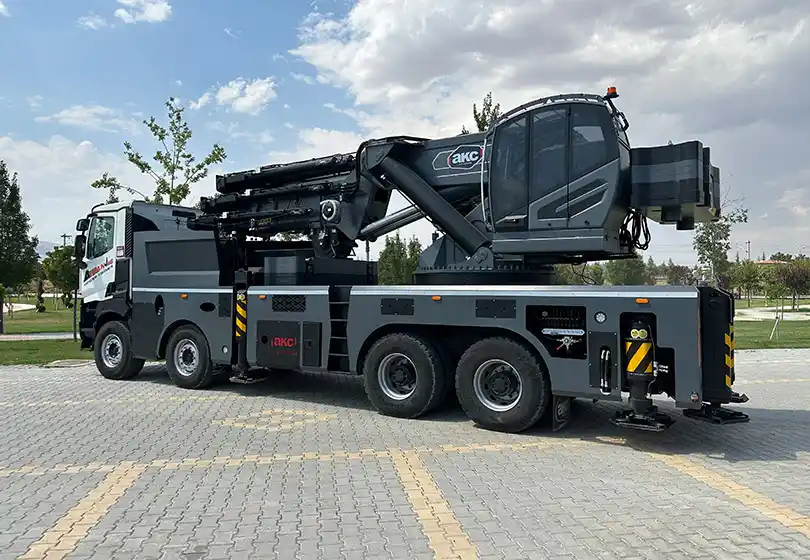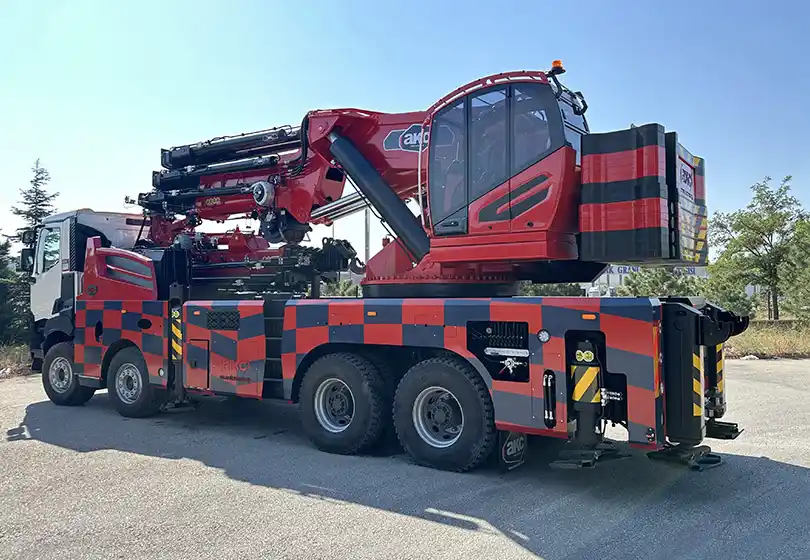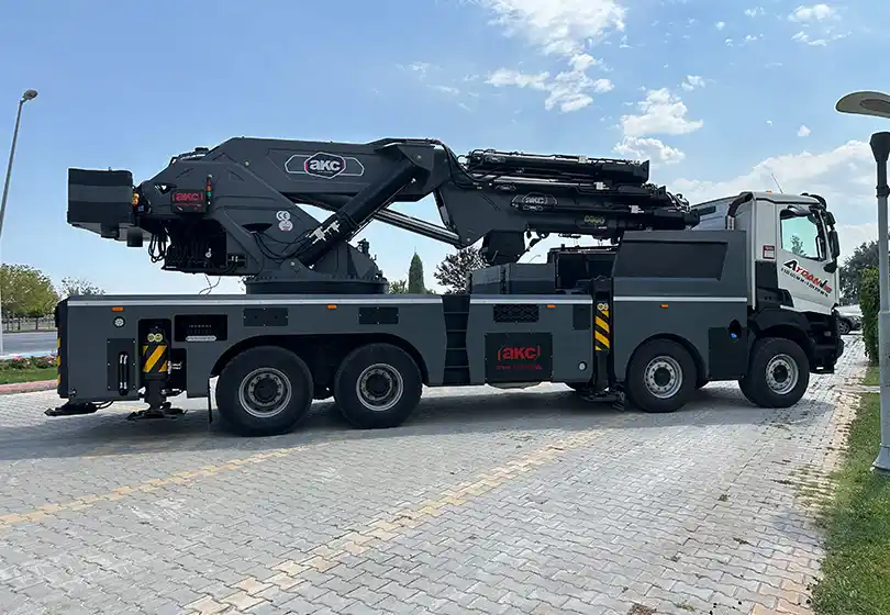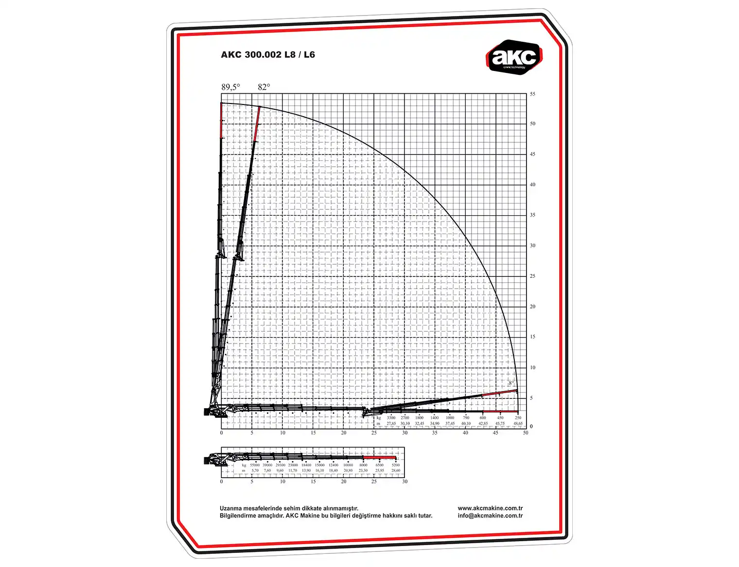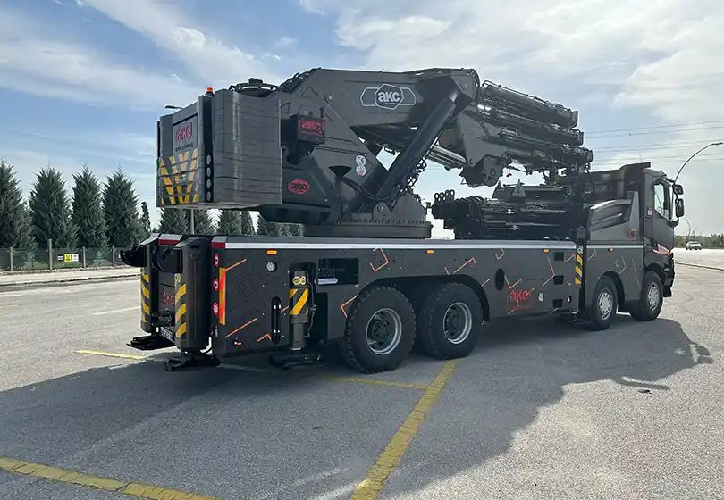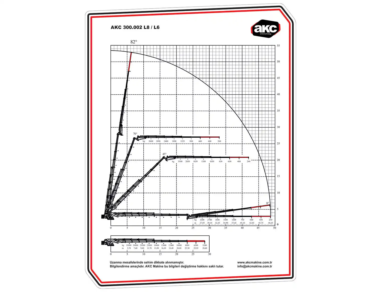 AKC 300.002 L8 / L6 Katlanır Bomlu Vinç, yüksek erişim imkânı ve güçlü kaldırma performansıyla geniş ölçekli projeler için geliştirilmiştir. Çift kırma bom sistemi sayesinde hem yatay hem dikey pozisyonlarda üstün çalışma esnekliği sunar. Kompakt katlanır bom tasarımı, dar alanlarda manevra kolaylığı sağlarken, uzun bom kombinasyonu geniş alanlarda yüksek erişim imkânı verir.